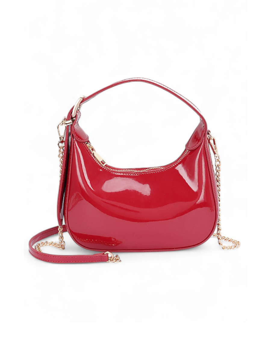 Red patent leather handbag with a buckle strap design and gold chain straps.