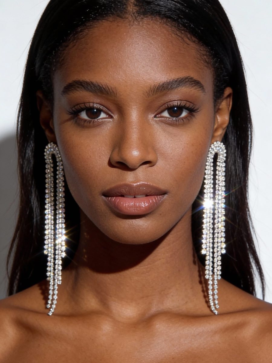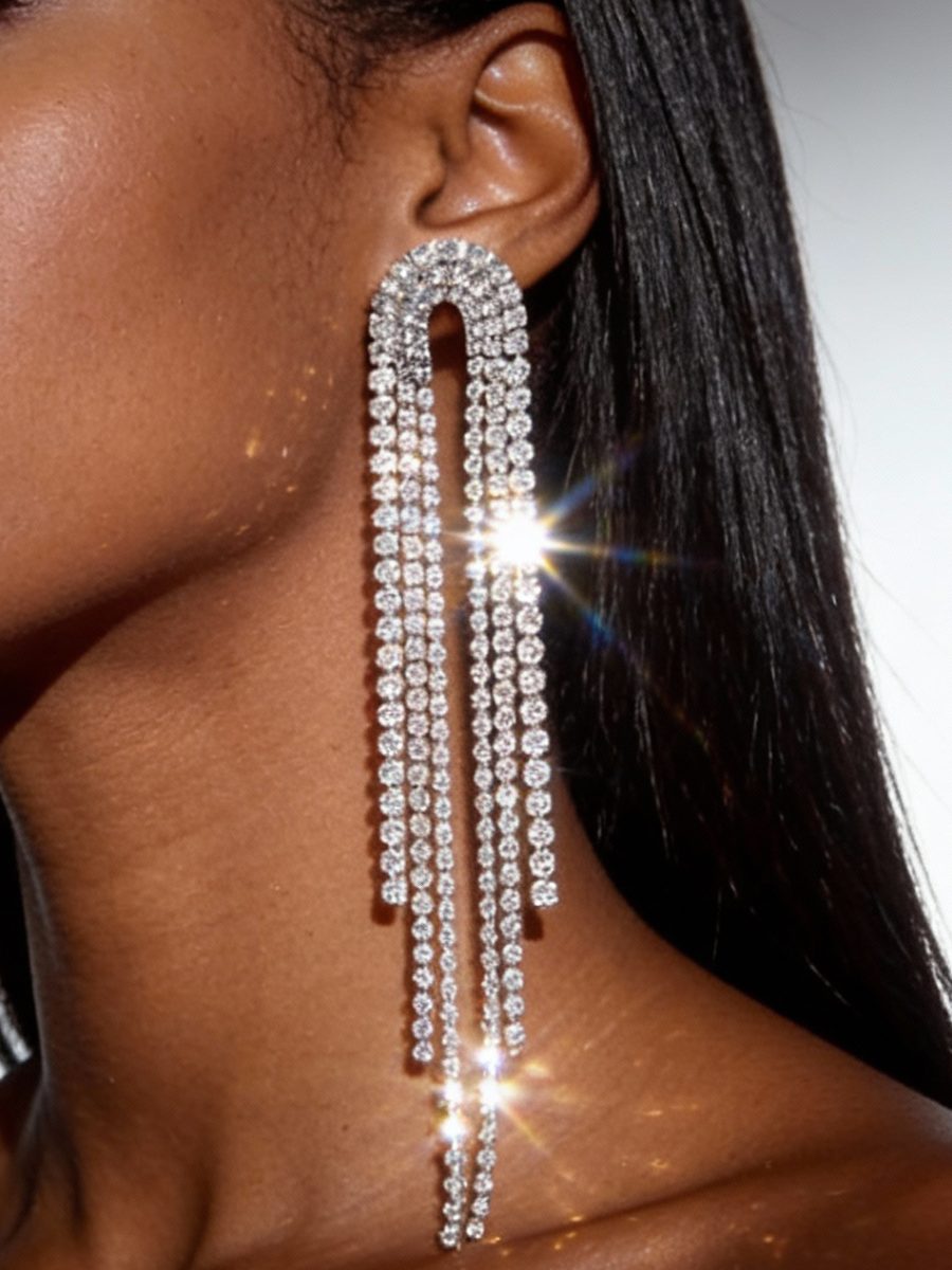 Arch shaped rhinestone fringe earrings with a silver tone.
