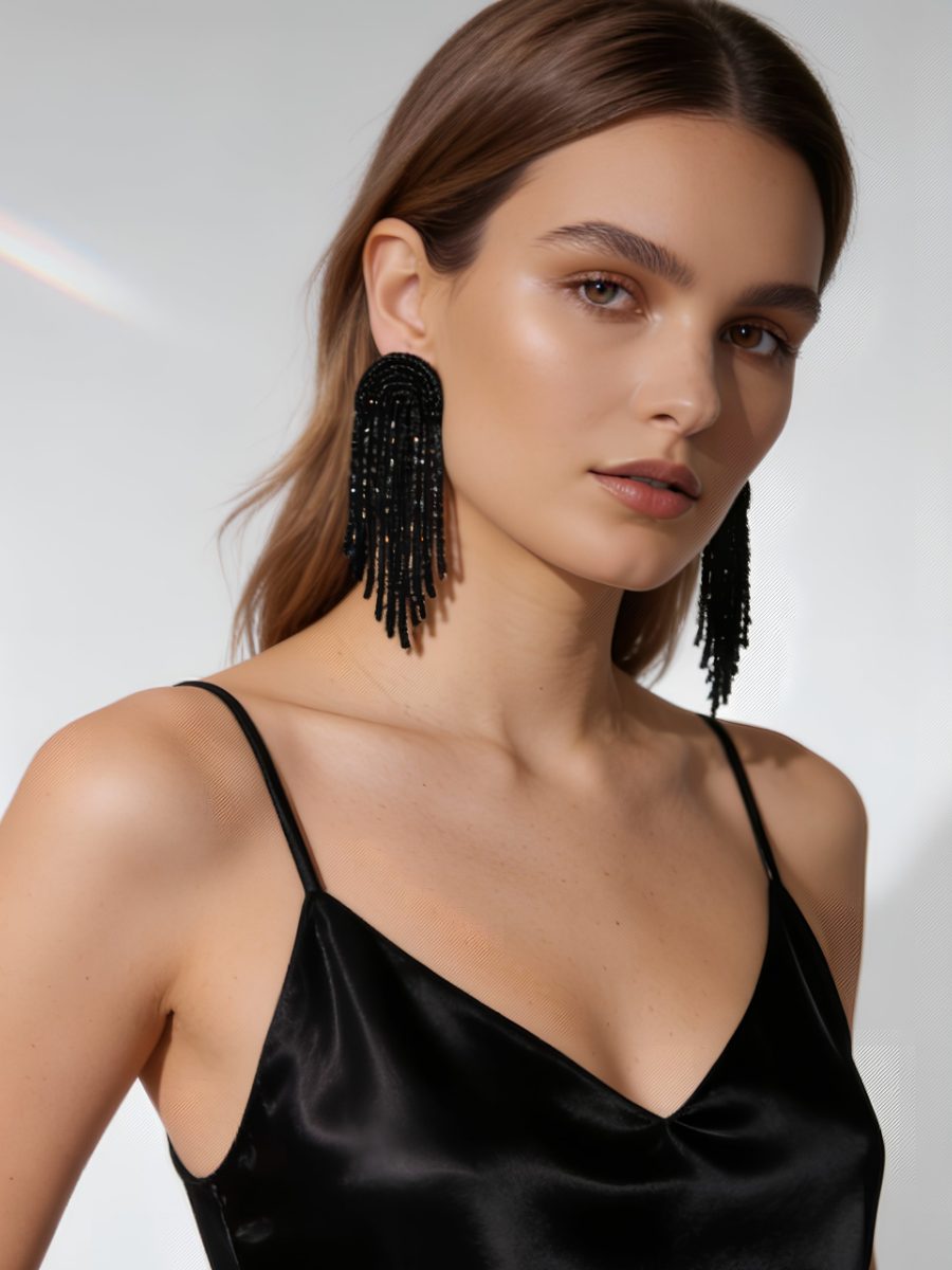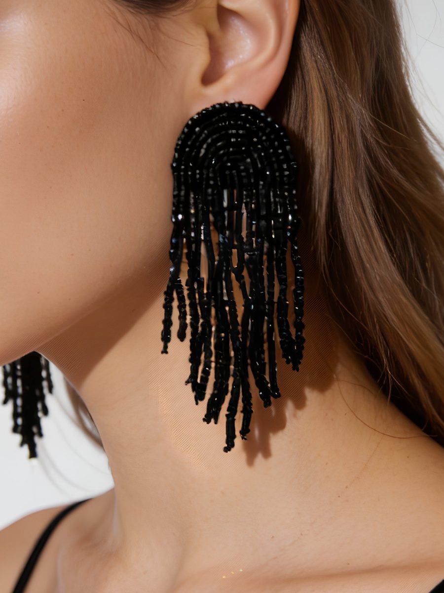 Arch shaped beaded fringe earrings in black. These handmade statement earrings are stringed with luxurious seed beads of various shapes, and lined with fabric for comfort.