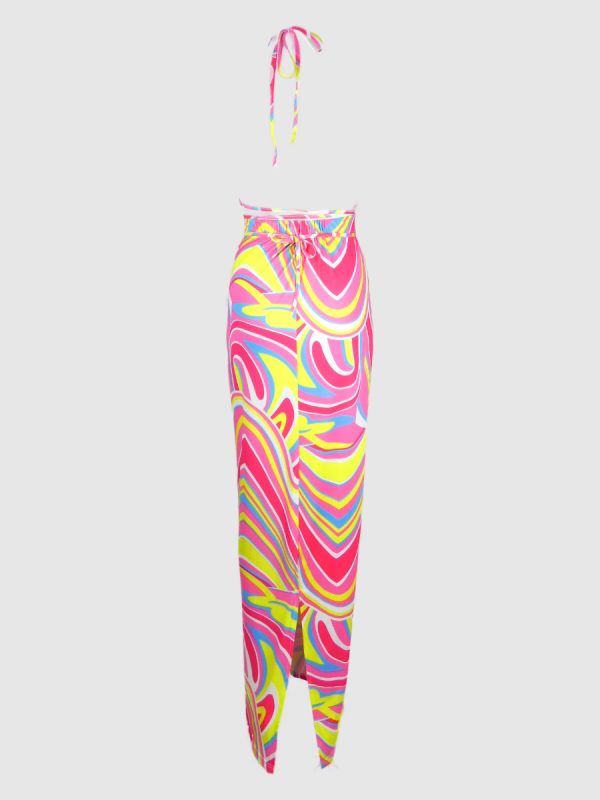 Vibrant halter dress with a bold funkadelic print made of stretch knit fabric with a slit in the back for optimal movement.