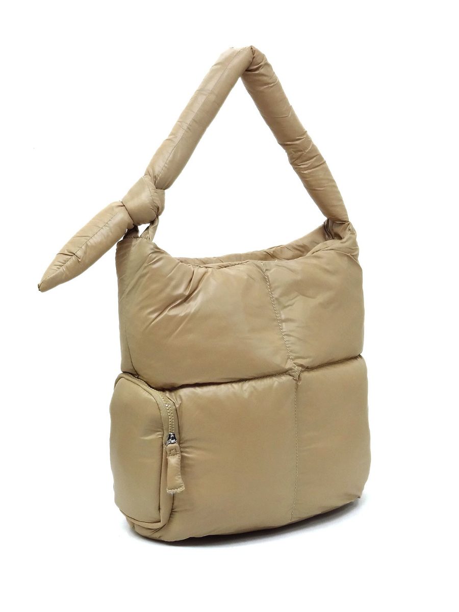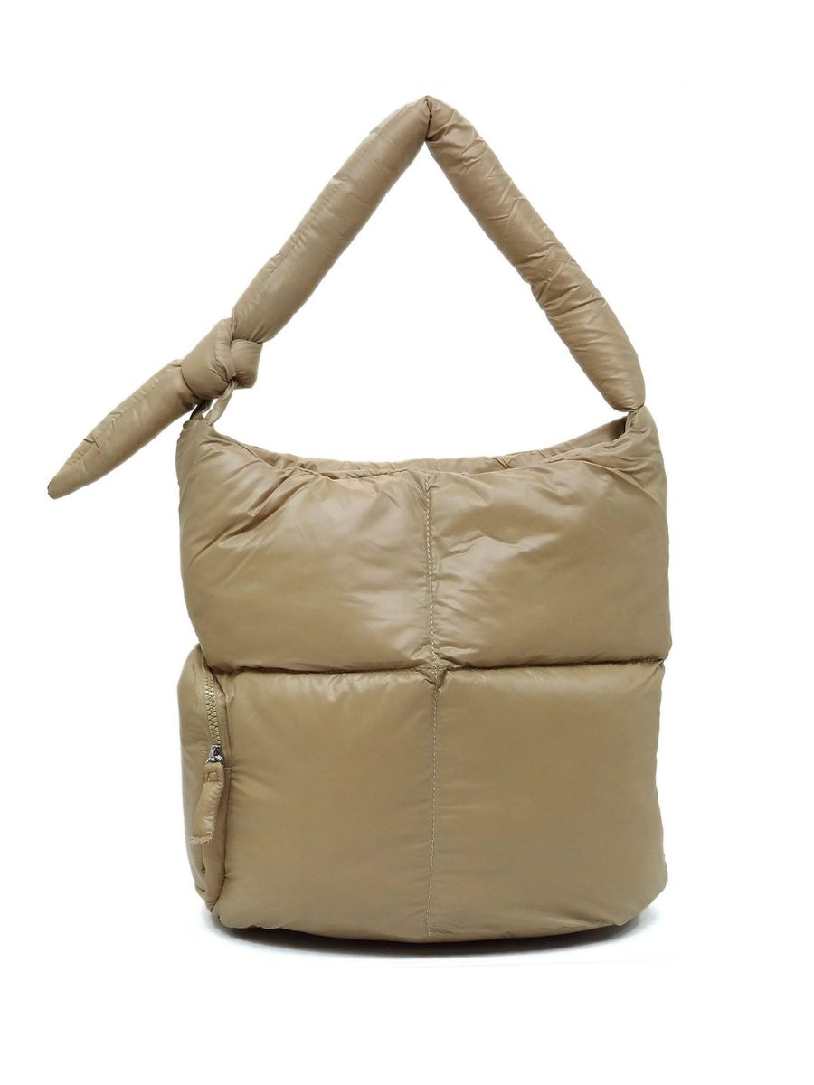 Elevate your winter wardrobe with this taupe puffer handbag, a cozy-chic accessory that blends fashion and function. Crafted from shiny quilted material, this voluminous bag features a knotted padded handle, a compact zippered pocket, and a soft, cloud-like silhouette inspired by designer outerwear. Whether you’re heading to brunch or bundling up for a snowy stroll, this winter-ready handbag adds texture, warmth, and editorial polish to any look.
