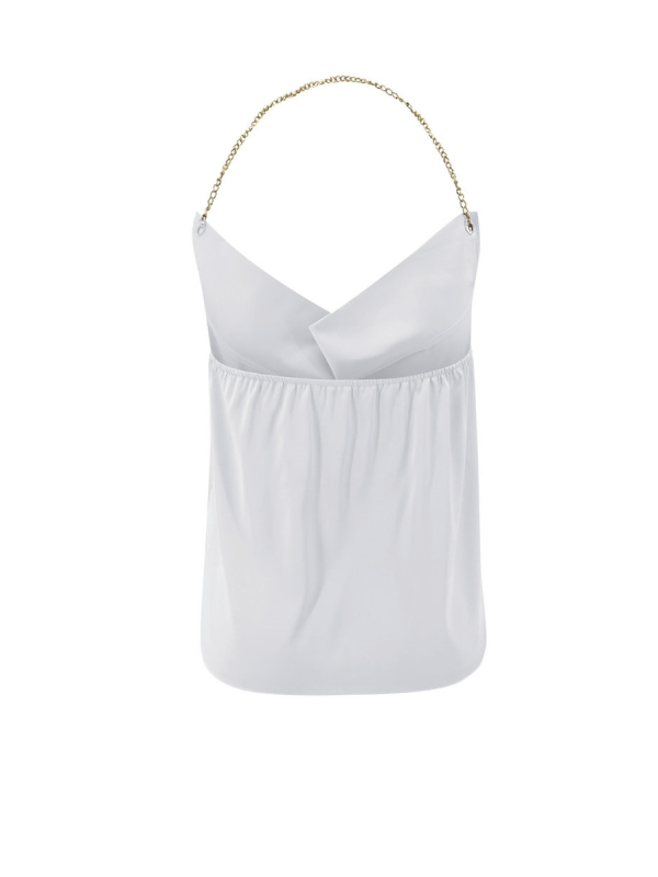 Cowl neck halter top with chain staps. Dress it up with a pair of slacks, or for a more casual look, wear with jeans.